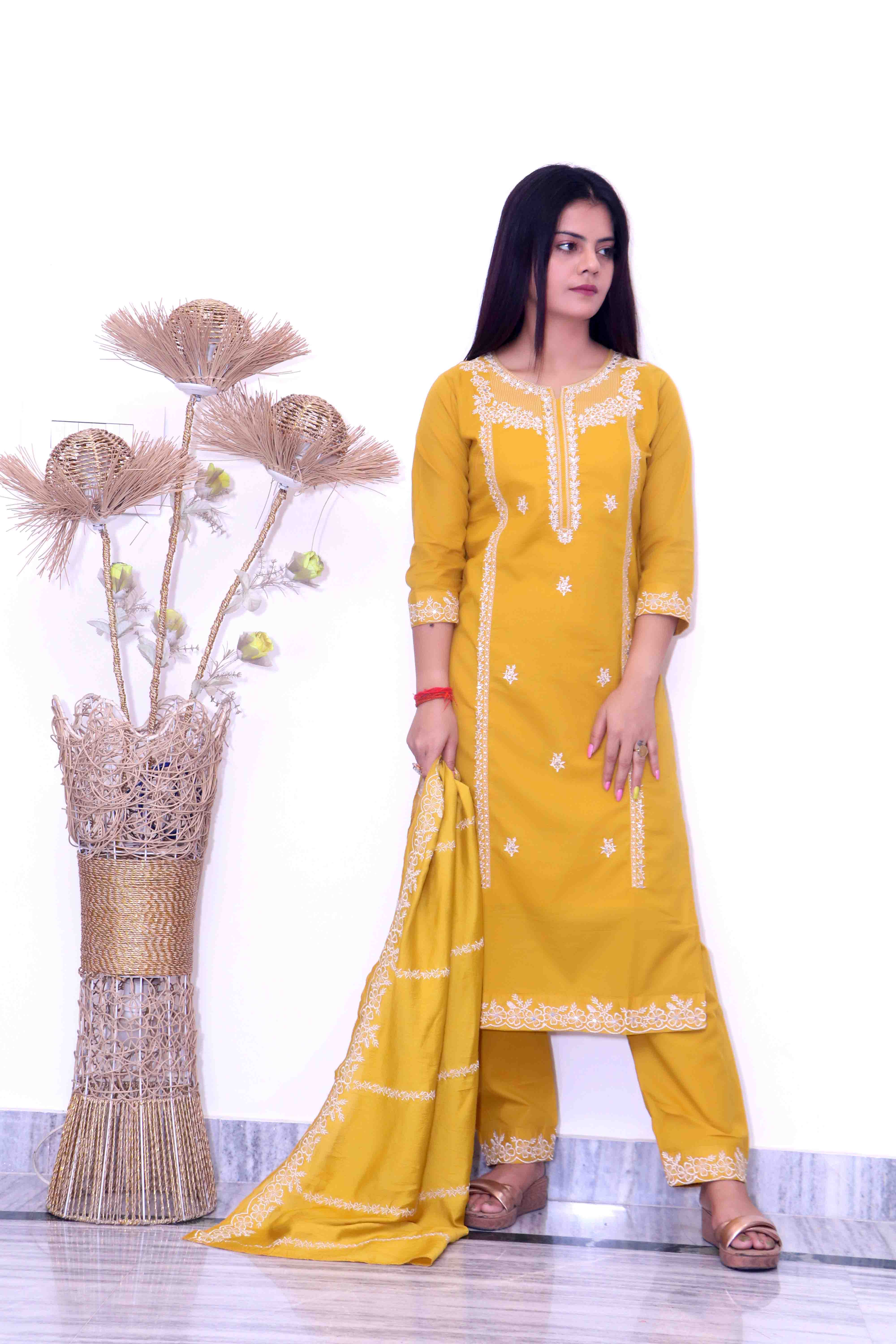 Women green embroidered neck kurta with plazzo and dupatta