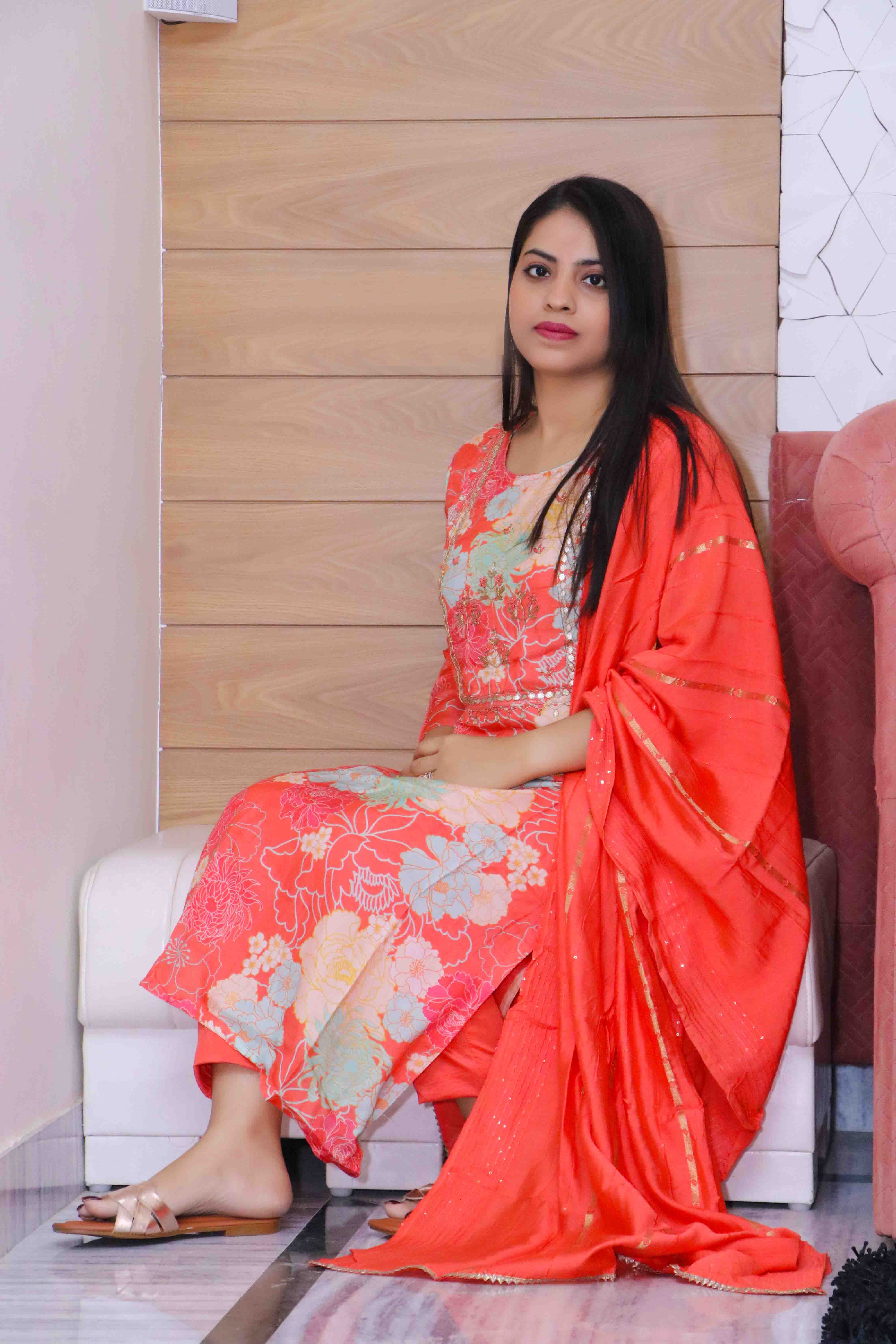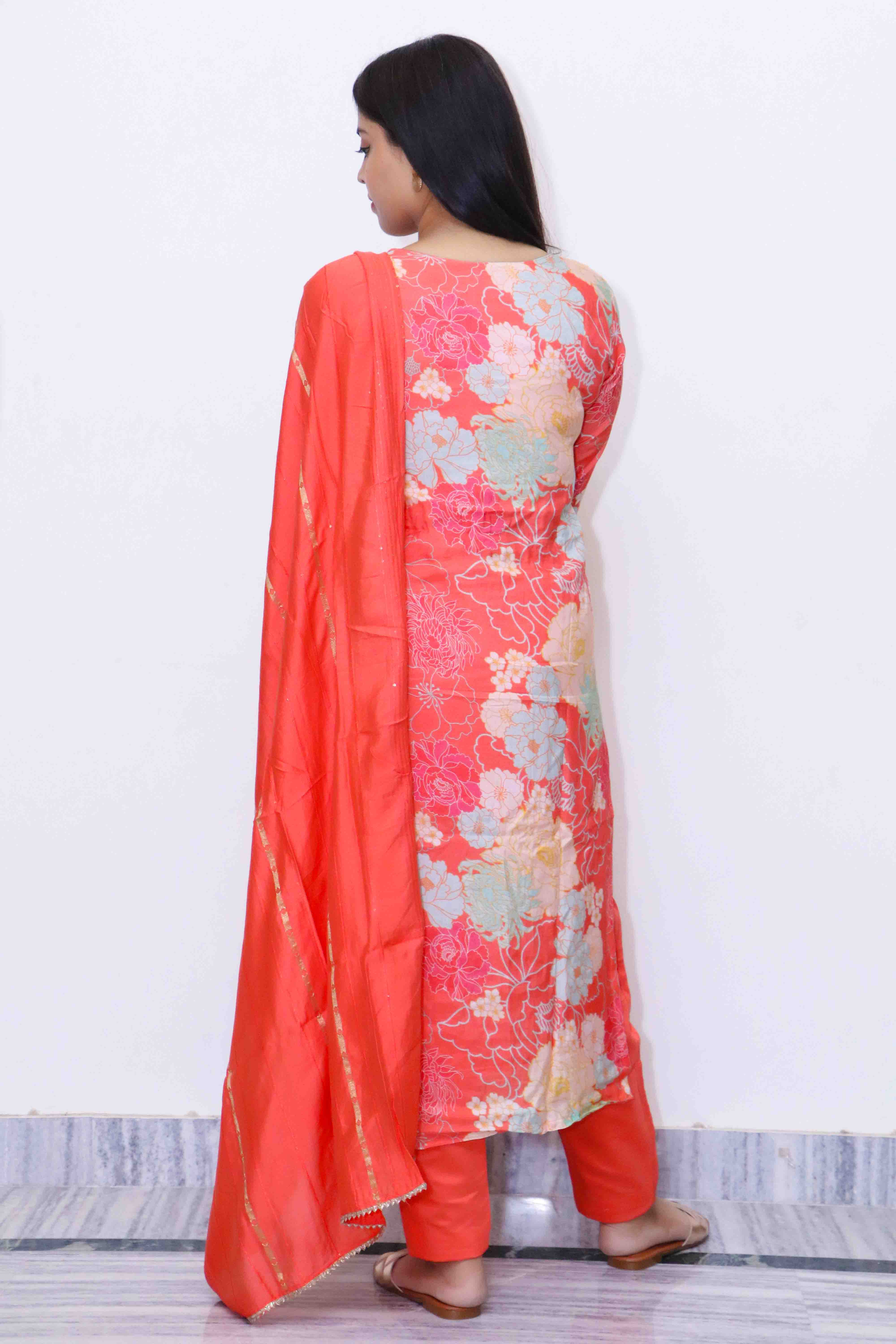 Experience the epitome of elegance with our Orange Floral Silk Printed Kurta, Straight Pants, and Dupatta set. This exquisite ensemble is crafted from luxurious silk, featuring a vibrant orange kurta adorned with delicate floral prints that exude sophistication and charm. The straight-cut kurta, with its classic round neckline and three-quarter sleeves, offers a flattering and comfortable fit. Complementing the kurta are straight pants in a coordinating shade, designed for both style and ease of movement. The set is completed with a matching dupatta, enhancing the outfit's elegance with its harmonious design. Perfect for festive occasions, special events, or sophisticated gatherings, this outfit blends traditional beauty with modern refinement, ensuring you stand out with grace and style.