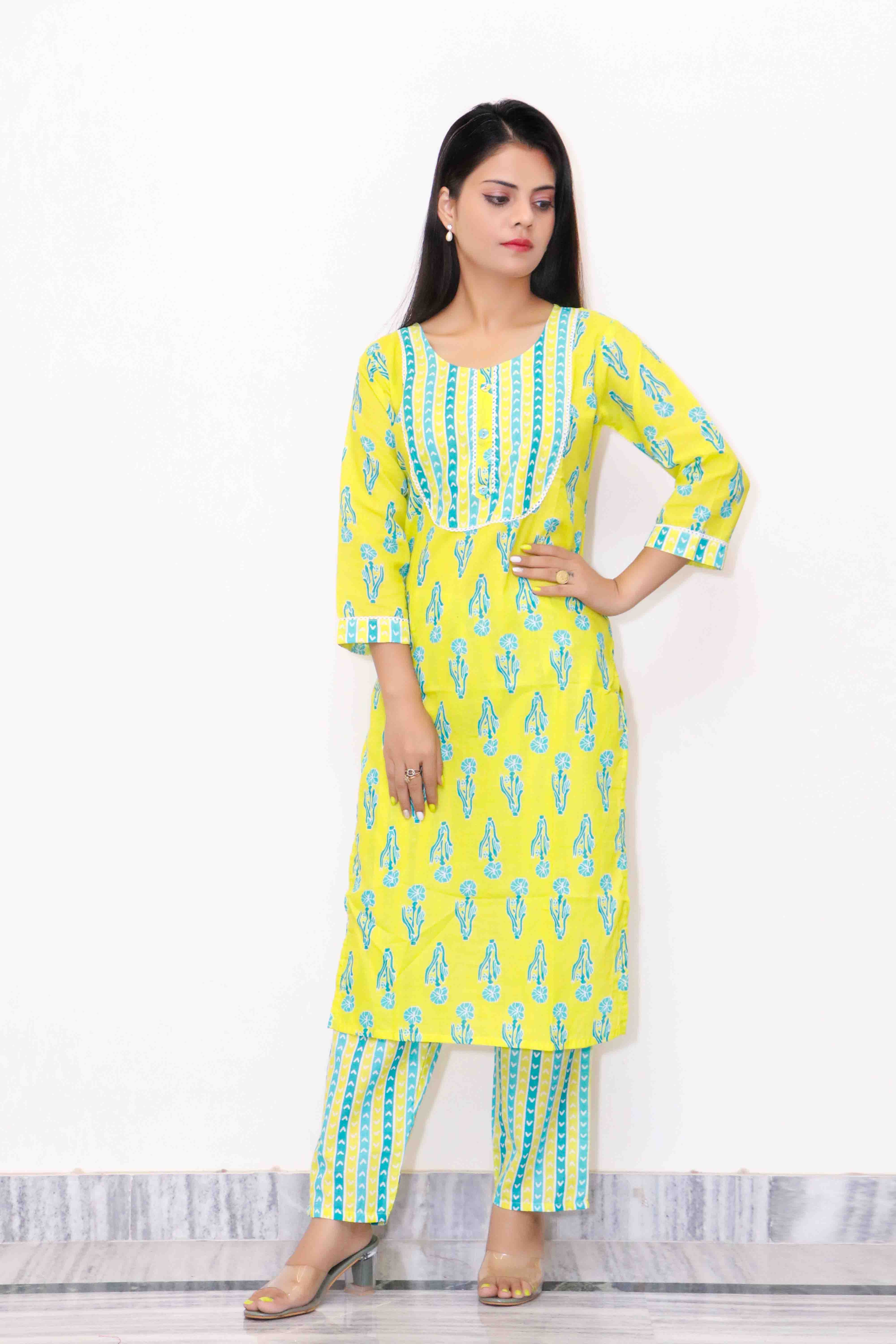 Elevate your ethnic wardrobe with our Women’s Yellow & Green Floral Printed Kurta with Straight Palazzo Set. This vibrant ensemble features a kurta crafted from soft, breathable cotton adorned with a lively floral print in refreshing shades of yellow and green. The kurta showcases a flattering V-neckline and 3/4th sleeves, offering a modern touch to the traditional design. The straight-cut silhouette and knee-length hem provide a comfortable and elegant fit, while side slits enhance ease of movement.