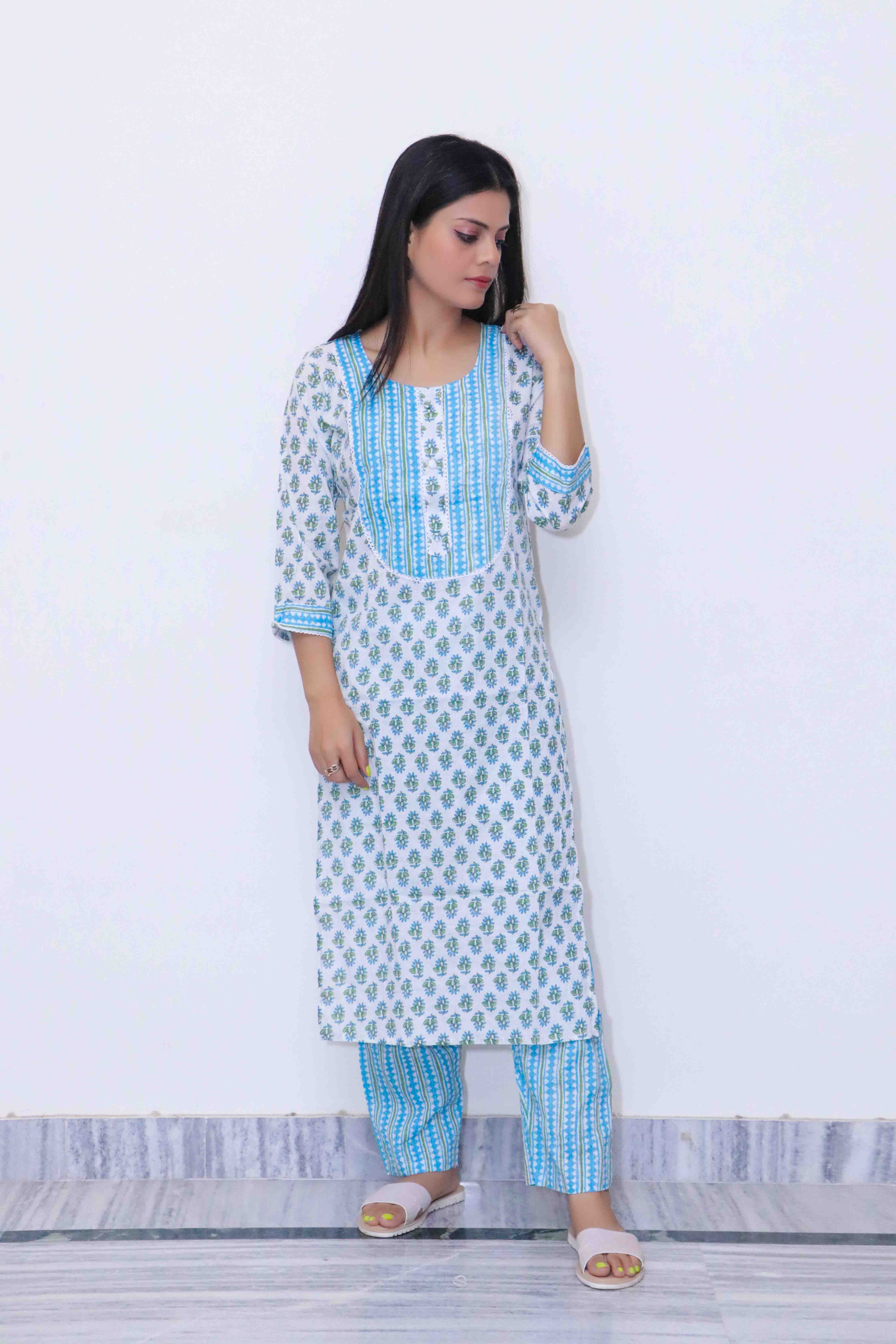 To maintain the pristine look of this set, machine wash in cold water with like colors, tumble dry low, and iron on reverse if needed. Available in sizes XS to XXL, this set pairs wonderfully with silver or oxidized jewelry and traditional footwear like juttis or sandals. Enhance your ethnic look with a coordinating dupatta or scarf, and step out in style with this beautiful blue and white ensemble.
