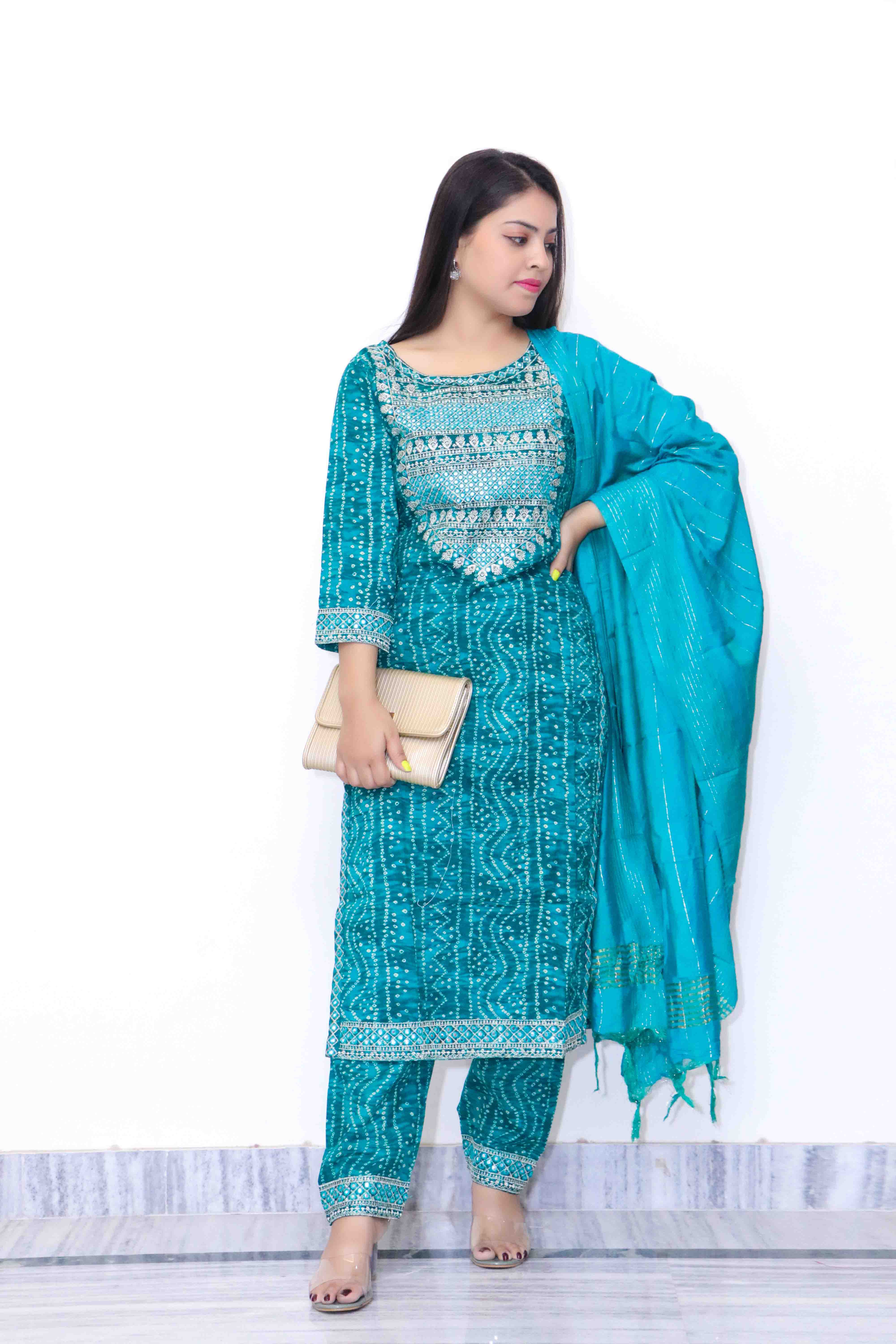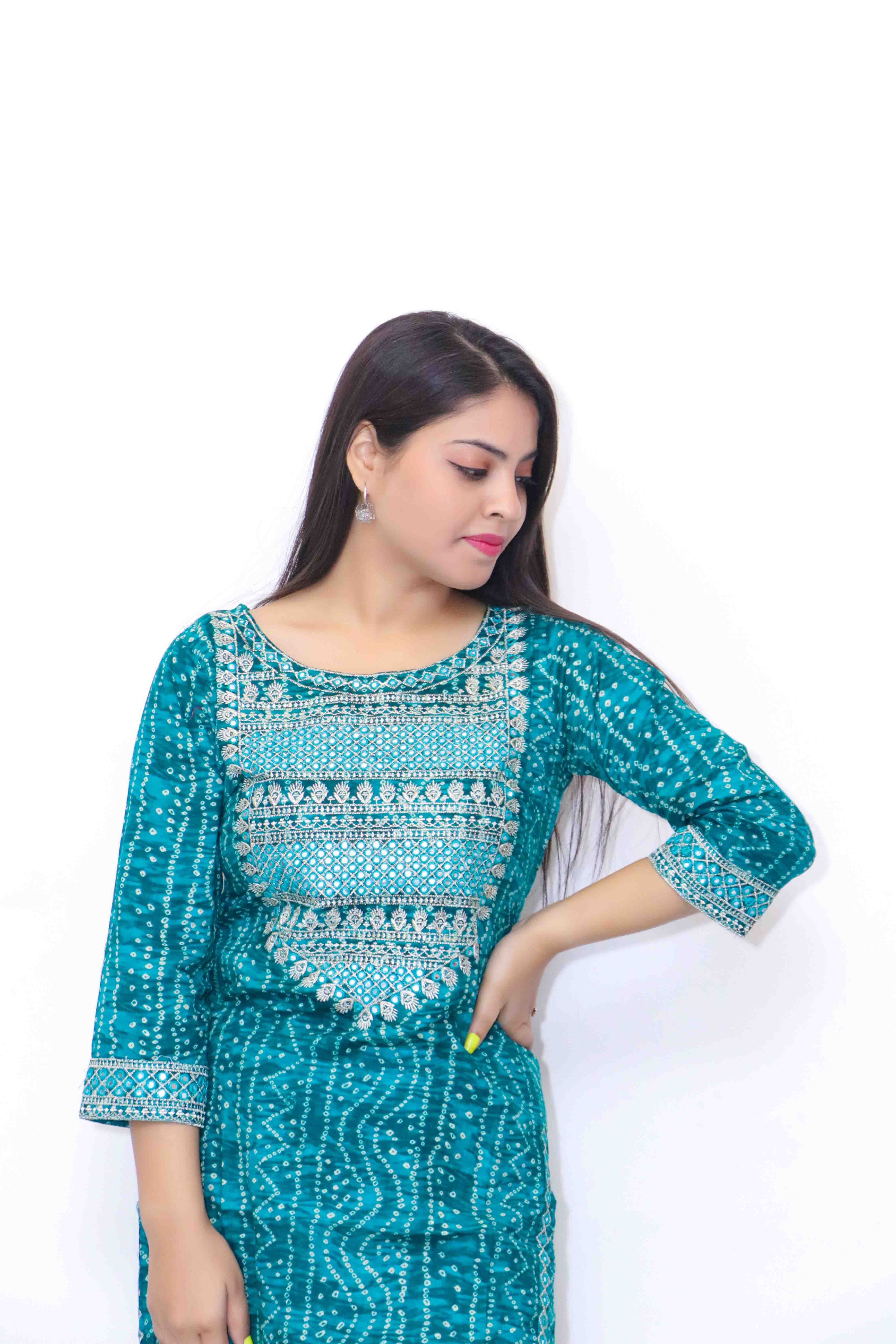 This exquisite ensemble features a teal green kurta adorned with traditional bandhani prints and intricate embroidery, paired with matching trousers and a coordinating dupatta. The kurta, crafted from high-quality fabric, showcases the timeless beauty of bandhani patterns, complemented by delicate embroidery around the neckline, adding a touch of sophistication and elegance. The straight-cut design of the kurta offers a comfortable and flattering silhouette, perfect for both casual and semi-formal occasions. The matching trousers provide a stylish and comfortable fit, enhancing the overall look with their tailored finish. Completing the set is a dupatta that mirrors the kurta's bandhani prints and embroidery, tying the ensemble together with a harmonious and graceful touch. This kurta set is ideal for women seeking a blend of traditional charm and contemporary style, making it a perfect choice for various festive and special events.