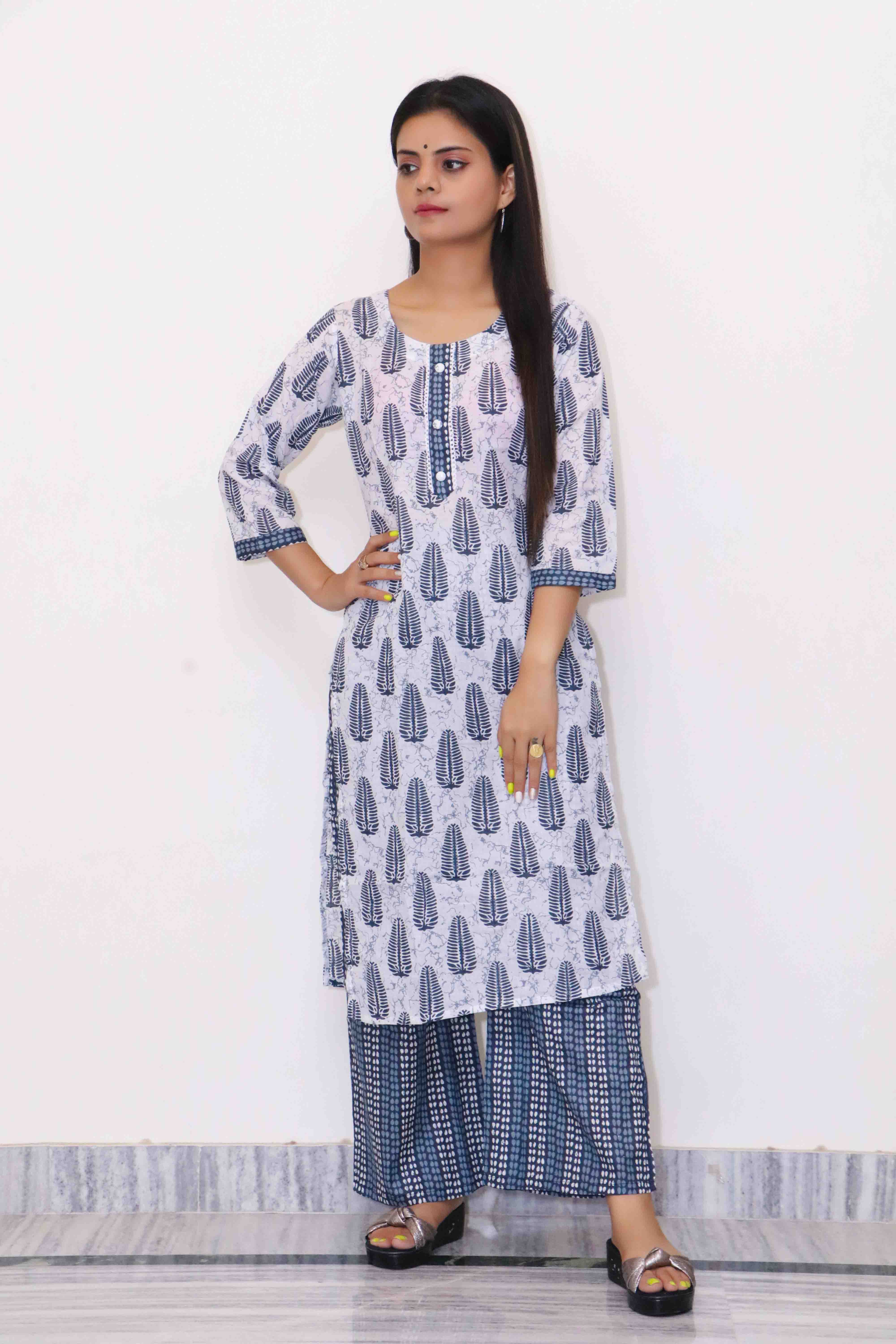 Introducing our stunning Women’s Grey & White Ethnic Printed Kurta with Palazzo Set, perfect for any occasion. Crafted from soft, breathable cotton, the kurta features an elegant ethnic print in white on a sophisticated grey base. The classic round neckline is accented with subtle piping, while the 3/4th sleeves are adorned with matching printed borders. Designed with a straight fit silhouette and calf-length hem, this kurta ensures both style and comfort, enhanced by the functional side slits and a front button placket. Delicate embroidery around the neckline and cuffs adds a refined touch to the ensemble.