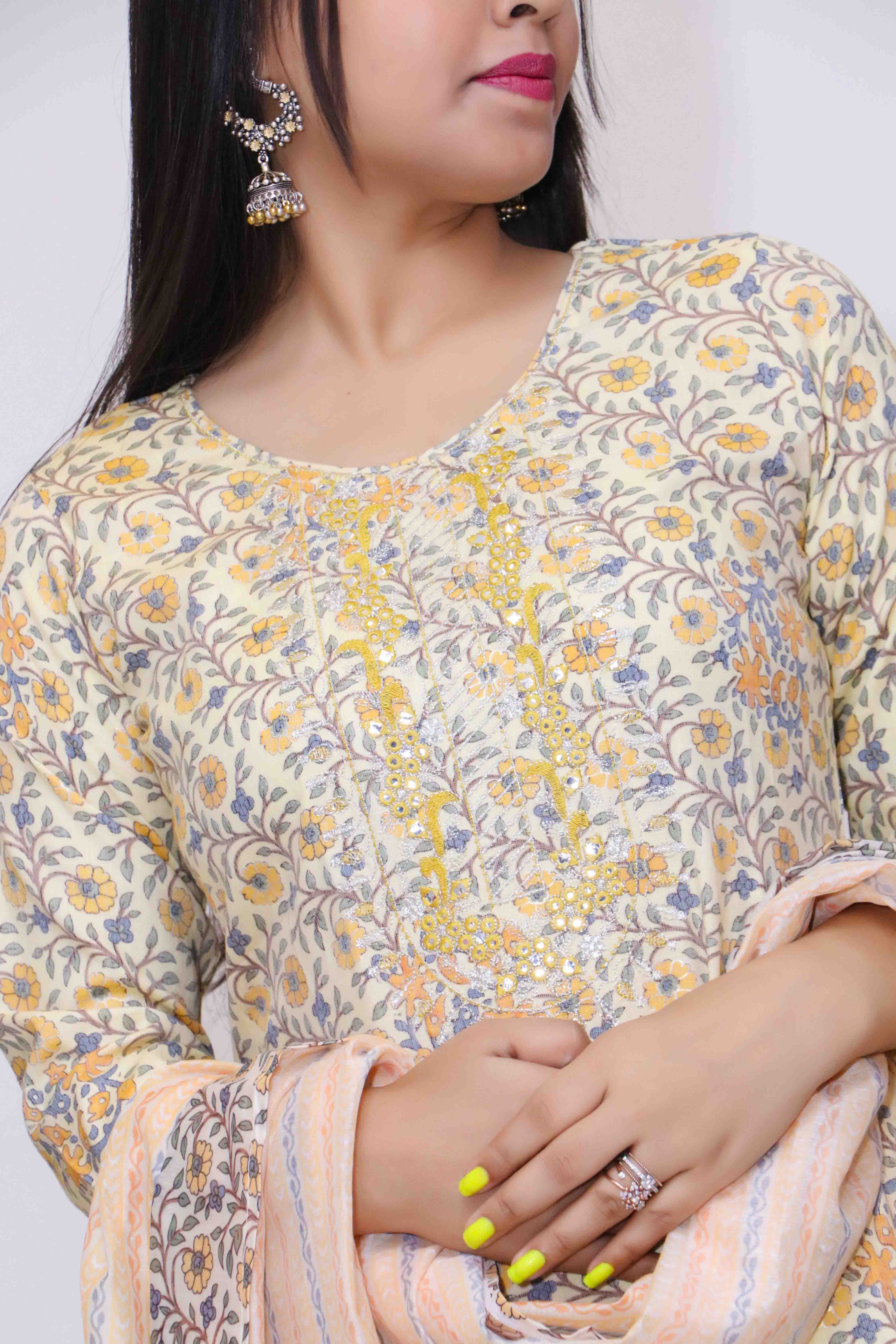 This stunning ensemble features a floral printed and embroidered neck kurta paired with matching palazzo pants and a dupatta, offering a complete and coordinated look that is both elegant and stylish. The kurta is beautifully crafted from high-quality fabric, showcasing a delightful array of floral prints that add a touch of nature-inspired charm. The neckline is intricately embroidered, providing a sophisticated focal point that enhances the overall design. The straight-cut kurta offers a comfortable and flattering fit, perfect for various occasions. Complementing the kurta, the palazzo pants are designed for both style and comfort, featuring a relaxed fit that allows for ease of movement. Completing the ensemble is a coordinating dupatta, adorned with matching prints and subtle embellishments, adding an extra layer of grace and elegance. This kurta set is ideal for women who seek a harmonious blend of traditional craftsmanship and contemporary design, making it a perfect choice for festive celebrations and special events.